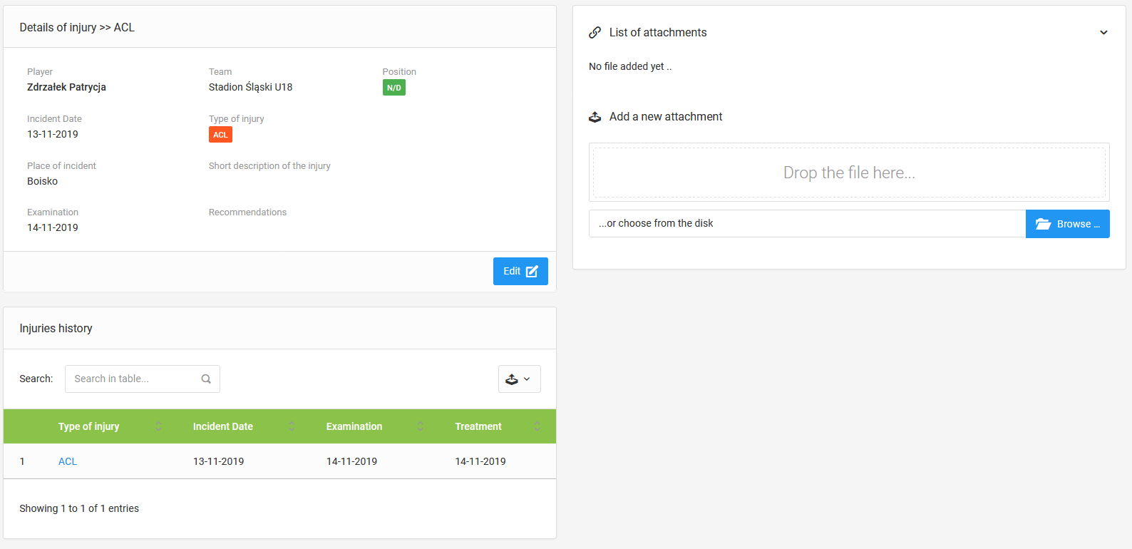 Each injury entered has its own history, where all details of the incident are recorded. Here you will be able to add a file with e.g. a hospital discharge or an X-ray as an attachment.