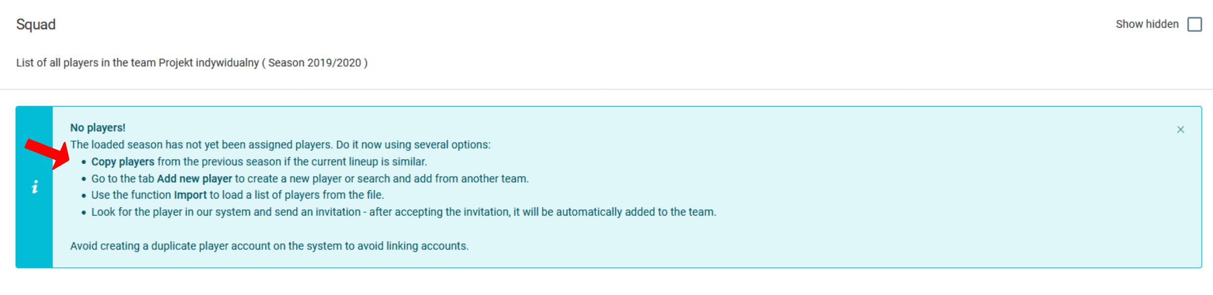 After creating the next season in your team, by entering the tab diary players squad you'll notice the lack of a player list. This situation is intentional and completely normal. Thanks to the player copy from the previous season function, in the new season you will only have players who actually stayed on your team in the new season.