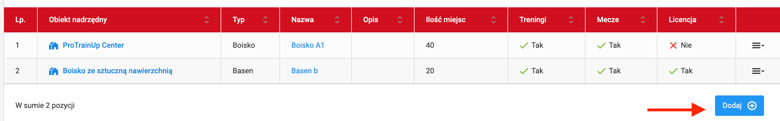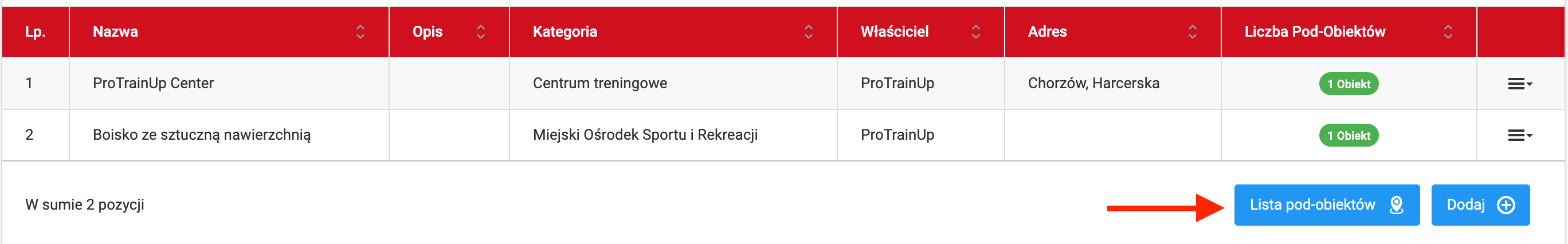 Aby dodać pod-obiekt w danym obiekcie nadrzędnym wejdź na na listę pod-obiektów i kliknij niebieski przycisk "dodaj". W danym obiekcie, możesz dodać dowolną ilość pod-obiektów. Pamiętaj, że to właśnie z pośród pod-obiektów będziesz wybierał lokalizację przy okazji dodawania treningu czy meczu.
